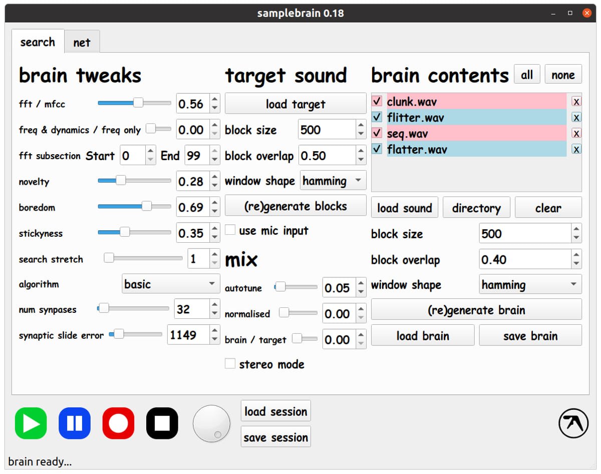 “Samplebrain chops samples up into a ‘brain’ of interconnected small sections called blocks which are connected into a network by similarity. It processes a target sample, chopping it up into blocks in the same way, and tries to match each block with one in its brain to play in realtime.”