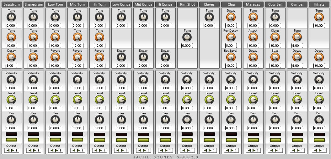 The plugin offers eight separate audio outputs for the drum channels, so users can apply third-party effects to the 808 drums.