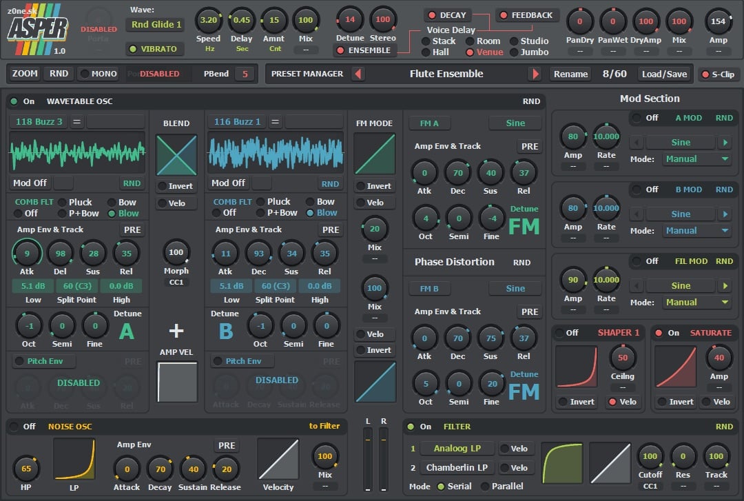 Asper comes with one wavetable oscillator and 118 wavetables. The wavetable oscillator is split into two layers, each of which has independent controls, including a Comb Filter and Detune.