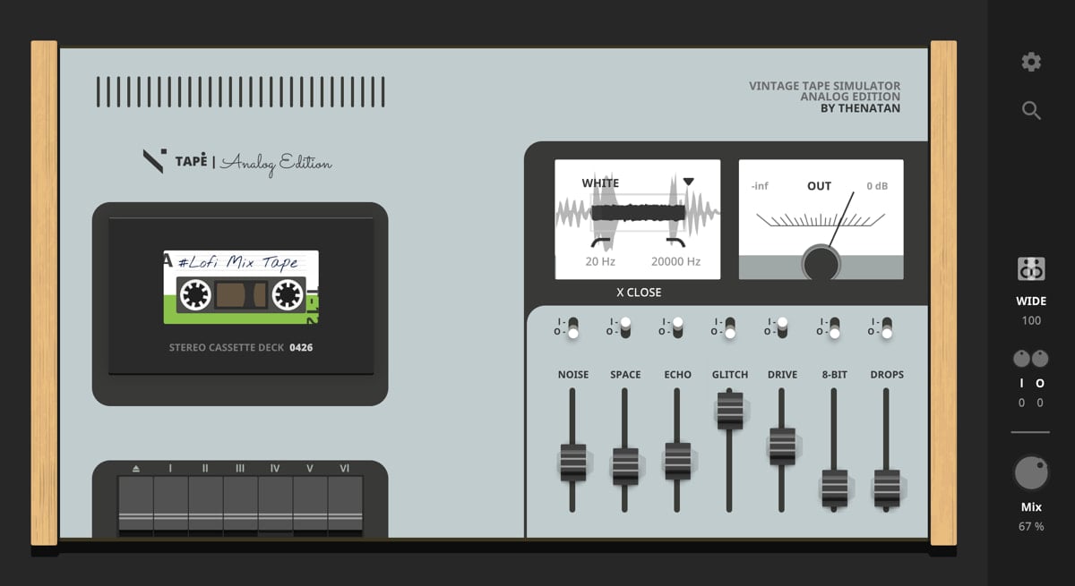 The TAPE plugin’s forefront is a set of seven faders, each controlling various effects. Users can choose between different noise levels, space, echo, glitch, drive, 8-bit, and drops.