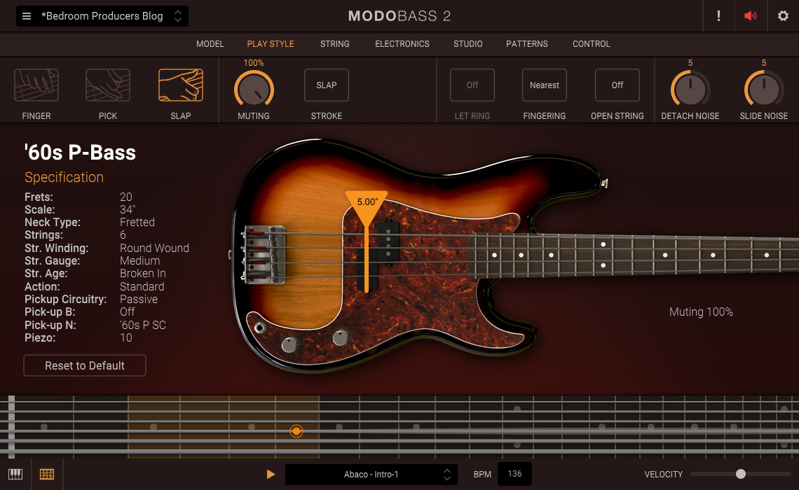 The free Modo Bass 2 plugin includes the ’60s P-Bass bass guitar and doesn’t offer the fretless play capability found in the paid edition of Modo Bass 2. It also contains a reduced number of bass patterns.