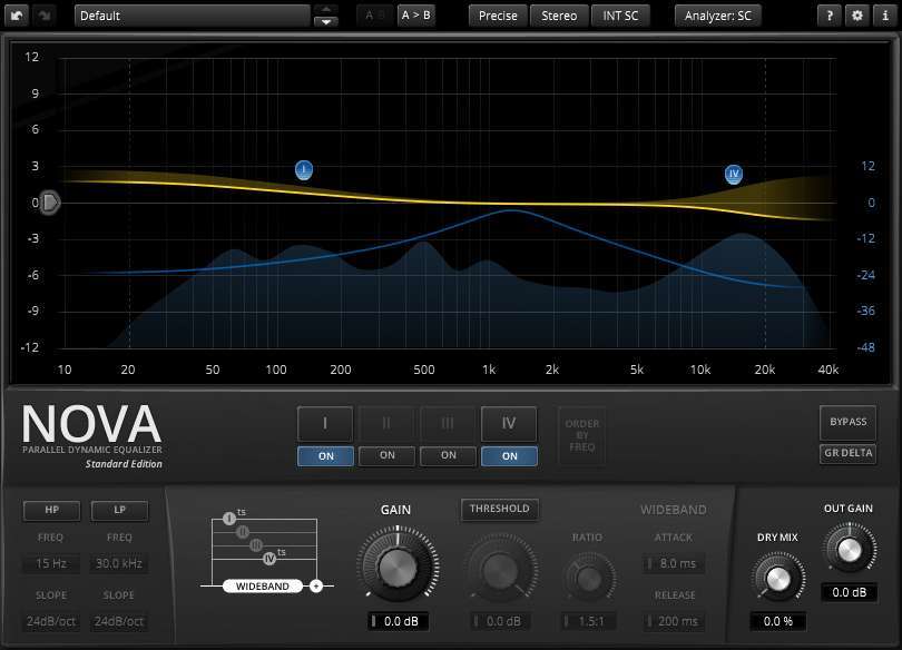 The brand new TDR Nova equalizer brings an improved set of features, packed in a much more refined user interface (although we were quite fond of the no-frills scientific look of the original Nova-67P plugin). TDR Nova sports a classic parametric equalizer layout, expanded with an elaborate dynamics section. The plugin is suitable for extremely precise and versatile dynamic processing of the audio material on the input, be it a full stereo mix or a single audio track. It can work well as your standard bread and butter parametric EQ, as well as a powerful dynamics processor with frequency selective compression and multi-band compression for mastering purposes.