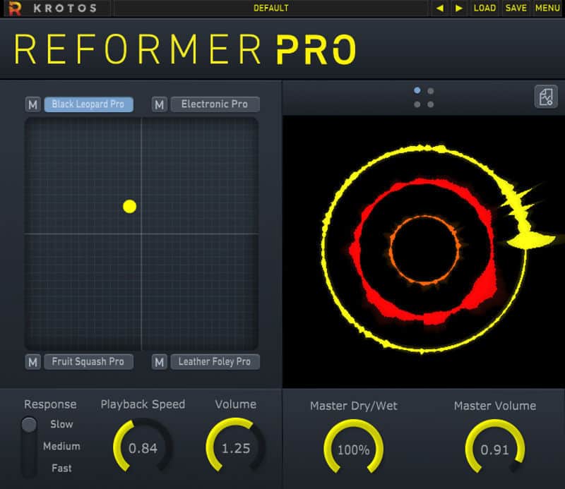 While most effects will use the audio signal on the input as the only sound source and process the input audio through various algorithms, Reformer Pro also has four slots to load four of its libraries. To explain this starting with a simple scenario, let’s say the X-Y pad used to select the library blend is all the way in one of the corners, so only one of the libraries is used (giving you basically what the free Reformer does). On receiving and analyzing input, Reformer Pro plays back the sound from the library which matches the input’s dynamic levels. So, load up the Black Leopard Pro library, and send a quiet piano note to the input, and you get a soft leopard growl. Short notes get short growls, and long notes low growls. Smash a loud note, and you get a roar. Move the X-Y pad somewhere else, and you get a blend of the other loaded data, which can vary from that leopard to polystyrene rubbing noises, or any user data library you create.