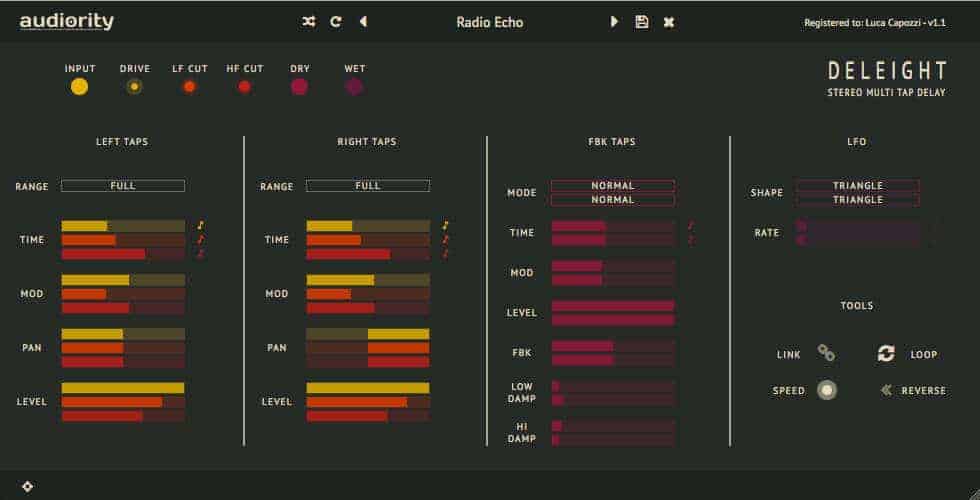 Deleight has four columns with controls for Left & Right Taps, Feedback Taps and LFO modulation. Both Left & Right Tap columns have identical controls, including a Range menu with seven different delay time ranges from five milliseconds to 2.5 seconds and also controls for tempo-syncable delay Time, Modulation, Pan and the output Level of each tap. Panning controls were added in a recent update, which really help to provide an extra layer of depth.