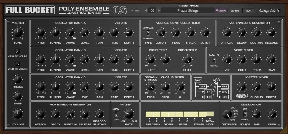 The PE-2000 has four core sounds; Pipe Organ, Chorus, Brass, and Strings, with two variations of each. One common complaint about the PE-2000 is that you couldn’t do much tweaking; you had to love the sound as it is to an extent. PECS, however, goes a step further with Tweak Mode, which allows you to adjust instrument parameters in ways the hardware doesn’t, making it more versatile.
