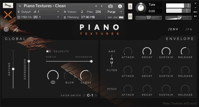 The instrument also includes a custom user interface for Kontakt. It lets you adjust the amount of detuning and expressiveness, the velocity curve, and the ADSR envelope for pitch and amplitude. Also worth noting are the Blur and Gloss controls for adjusting the piano’s tone.