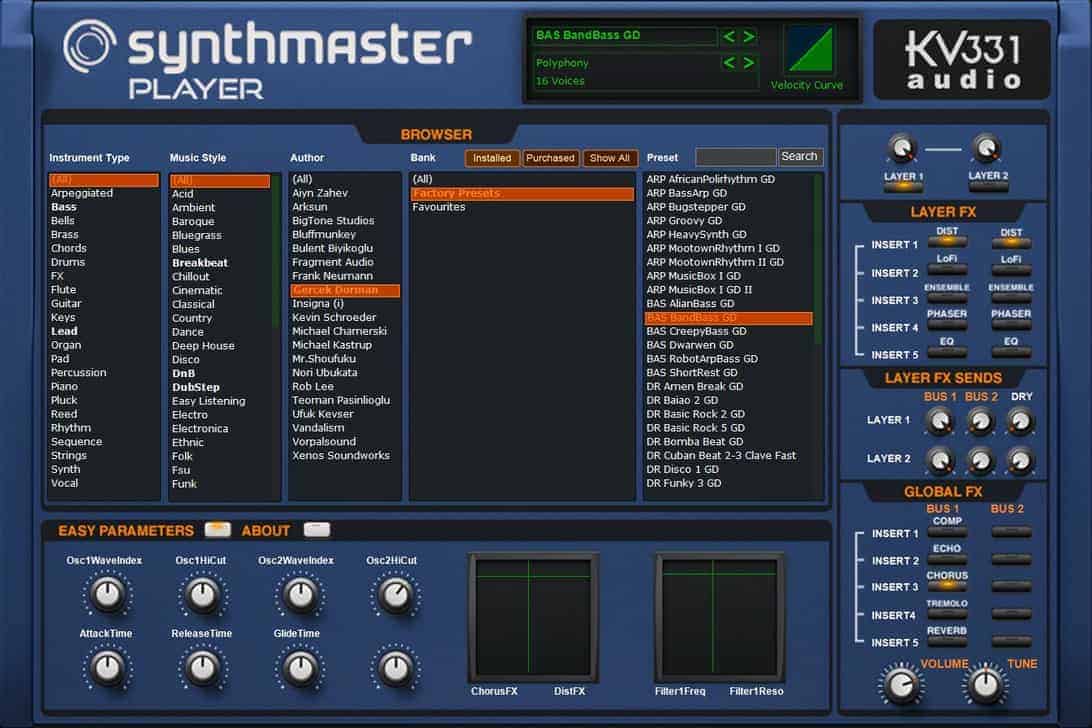 SynthMaster Player is based on the same synthesis engine as the full edition of SynthMaster. It has the same synthesis capabilities under the hood, except the user can’t access most of the parameters.