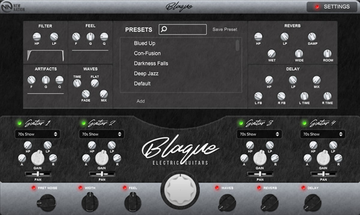 Blaque dark electric guitar has been designed to give players an easy way into some classic and some experimental guitar sounds. Characterized by dark and grimy lo-fi textures, this plugin is useful for any producer wanting to turn their guitar into something a little sludgier.