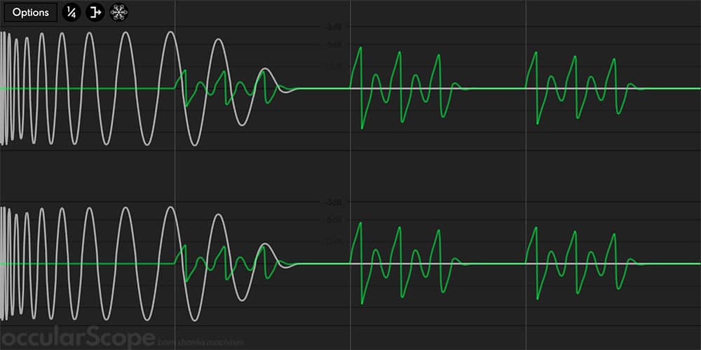 occularScope is an oscilloscope plugin that can be synchronized with your DAW. This is useful for pinpointing a specific part of the audio track and monitoring how its waveform is affected by other plugins in real-time. For example, you can zoom in on a particular kick drum and watch how your compressor shapes the kick’s attack transient and the body. Or, you can load occularScope on a bus track and analyze how the kick and the bass guitar are interacting with each other.