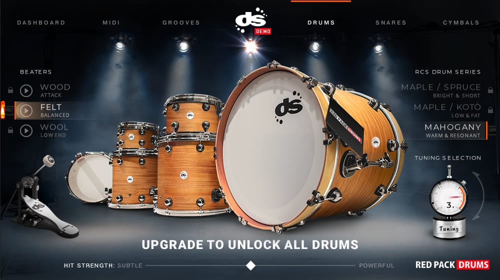 The Mahogany kit, a FREE demo from the DS Drum – RCS Essentials pack by Red Pack Drums, offers ready-to-use drum sounds with an intuitive interface.