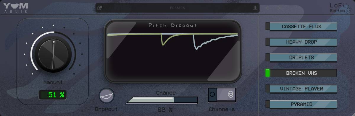 Lofi Pitch Dropout ($75 standard price, $60 with discount) delivers variations of pitch errors as caused by worn tapes. It features six different modes, including Cassette Flux, Heavy Drop, Driplets, Broken VHS, Vintage Player, and Pyramid.