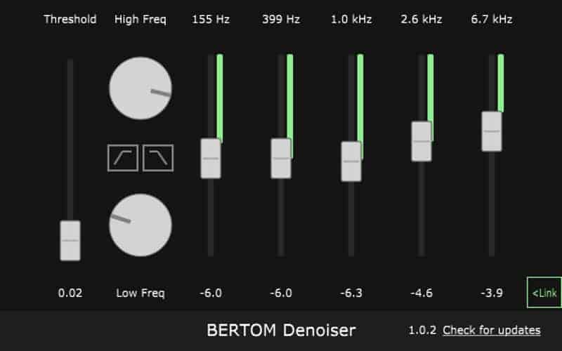 The interface features a pair of filters (high-pass and low-pass) and five vertical sliders for adjusting the noise reduction on five different frequency bands. All five sliders can be moved simultaneously by clicking and dragging the Link control. The slider on the left side on the interface controls the Threshold value for the noise reduction algorithm.