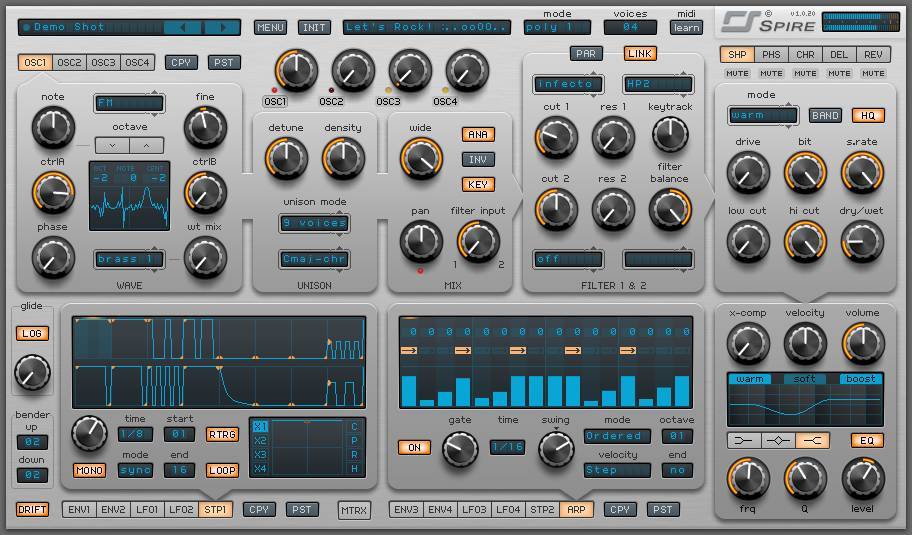 Not only does Spire offer a wealth of features, but it provides access to those features in a manageable and beautiful interface, somehow keeping hidden pages and tree menu navigation down to a minimum, resulting in a fluid, unencumbered workflow. This is what I like to see. The controls are laid out in a very organized manner. I don’t feel overwhelmed or intimidated. I have no trouble keeping track of what I’m doing or what I was doing five minutes ago. I can go right to work and have fun while I’m doing it!