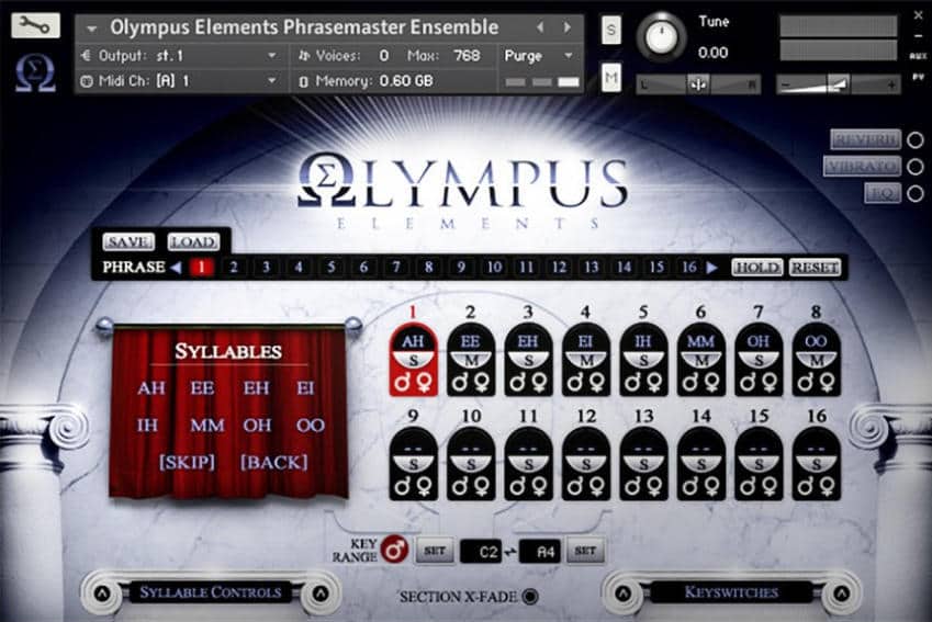 Perhaps because the engine is adapted from much larger and more full-featured choirs, the sheer number of available controls provides the user with the ability to milk these sounds for all they’re worth. For example, while this choir can’t sing any lyrics, it still has a phrase builder which allows sequences of vowels to be created. So, if you want the choir to sing “oo oo oo ah ah”, that’s very simple to do, and there’s room for up to 16 phrases of 16 vowels each, with the ability to set each to marcato or staccato.