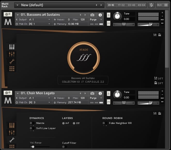 The strings and choirs include true legato instruments which seem to have some clever scripting in the background, making the transitions between notes different in fast vs. slow passages. The morphing between velocity layers is always very smooth, even when there are not many layers actually sampled. In general, this is an extremely well scripted engine for orchestral music. A less important but nice feature is that the number of round robins and velocity layers is visible directly from the Kontakt interface – many developers hide this information.