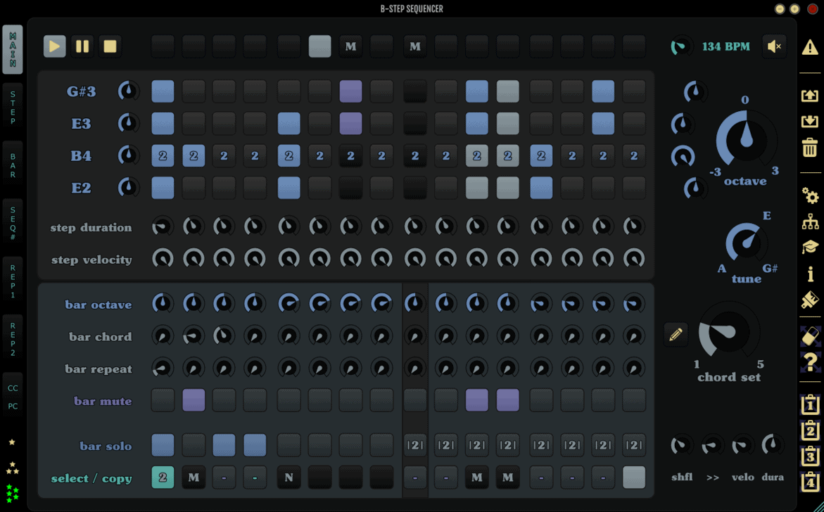 B-Step Sequencer is a versatile sequencer for creating melodies, basslines, chord progressions, arpeggios, and sequencing drums. It is optimized for multi-touch displays, which are becoming more and more common on laptops nowadays.