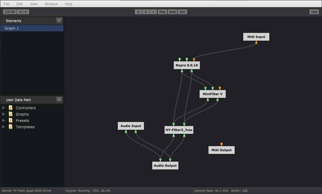 As for the application’s features, it was designed to work as a modular environment for third-party VST and AU plugins. In Element’s modular view, called the Graph Editor, you can chain together any number of your favorite virtual instruments and effects in parallel or in series. This is done by using virtual cables, in the same manner in which you’d connect the modules of a virtual modular synthesizer like VCV Rack, except that any number of devices can be connected to a single device’s audio input in Element. In other words, you could, for example, feed the output of Grooove BPB, Xfer Serum, and Dmitry Sches Thorn to Fabfilter Pro-G simultaneously, simply by connecting the synths’ audio outputs to Pro-G’s audio input. Double-clicking a loaded plugin opens its GUI, so adjusting plugin settings will work the same as in your DAW.