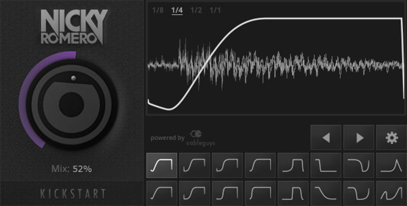 Nicky Romero Kickstart is a virtual effect available in VST and AU plugin formats for PC and Mac based host applications. The plugin was crafted by the Cableguys, in collaboration with Nicky Romero. It comes at a reasonable price of €10 ($15) and is surprisingly easy to use. Kickstart is as WYSIWYG as plugins go. What you see, is quite literally what you’ll get on the output.