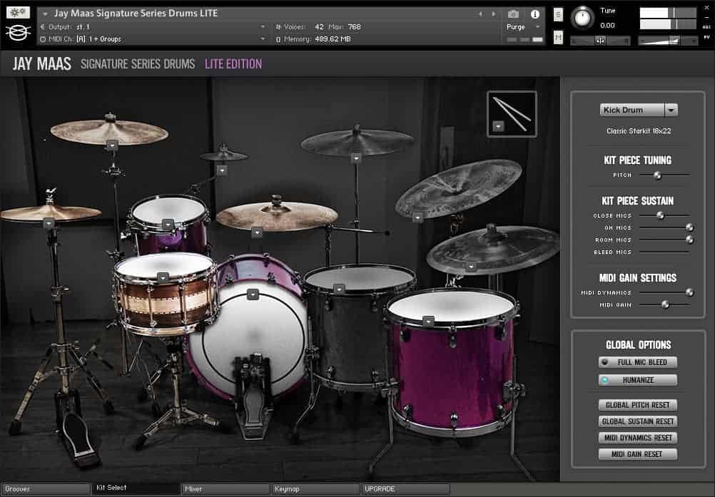 Keep in mind that the free version of the Jay Maas signature kit only features seven drum kit pieces from the full library. The kit elements that aren’t included are greyed out on the interface. You get one kick, one snare, two toms, and three cymbals. The free library also doesn’t have multi-out support, microphone bleed, and the groove library that comes with the full version of the kit.