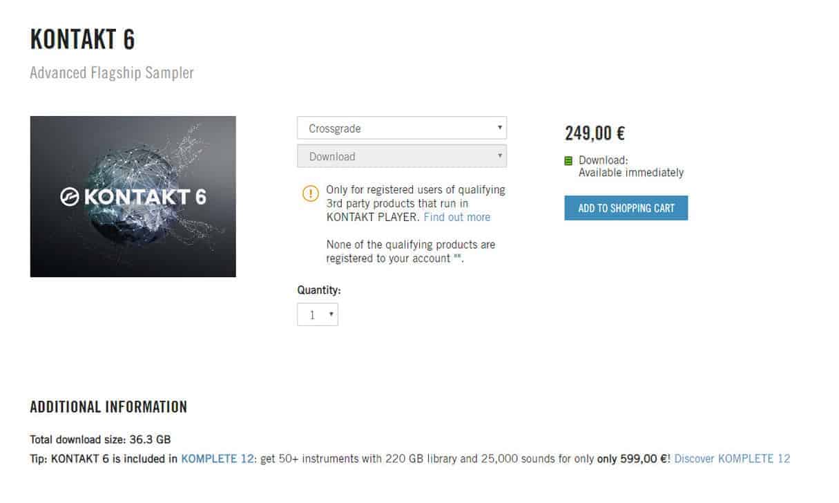 Native Instruments have a Kontakt crossgrade offer in place for users who own a third-party Kontakt library in their account. The crossgrade price is €249, and that can be combined with the 50% OFF deal during a sale. So, with the crossgrade offer and the 50% OFF discount combined, you can get a sweet €125 deal.