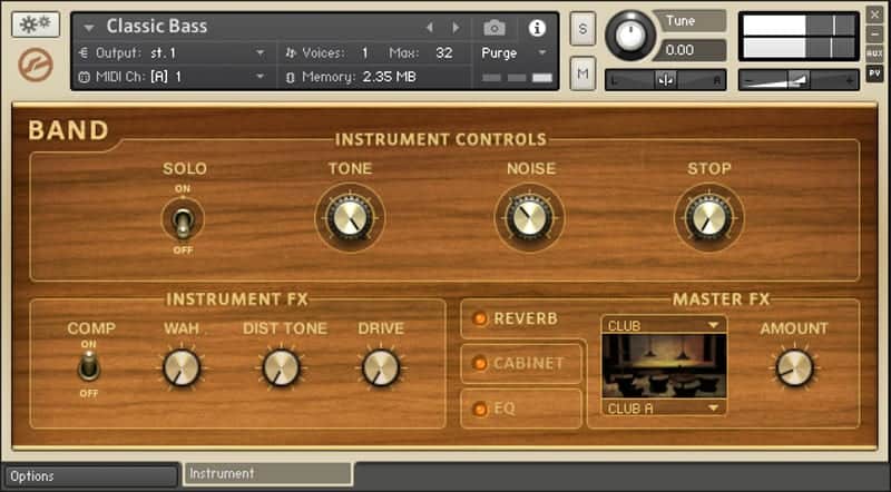 The Kontakt interface features a twelve-channel virtual mixer with a selection of audio effects. Also, the user can adjust the individual kit piece tunings, sustain, volume envelopes, MIDI mappings, and several other performance controls.