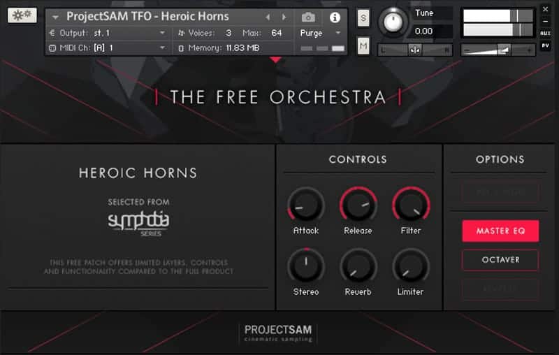 ProjectSAM’s free Kontakt library includes fourteen patches packed into a 1 GB download. It covers a range of orchestra sounds, from string staccatos to brass clusters and symphonic percussion.
