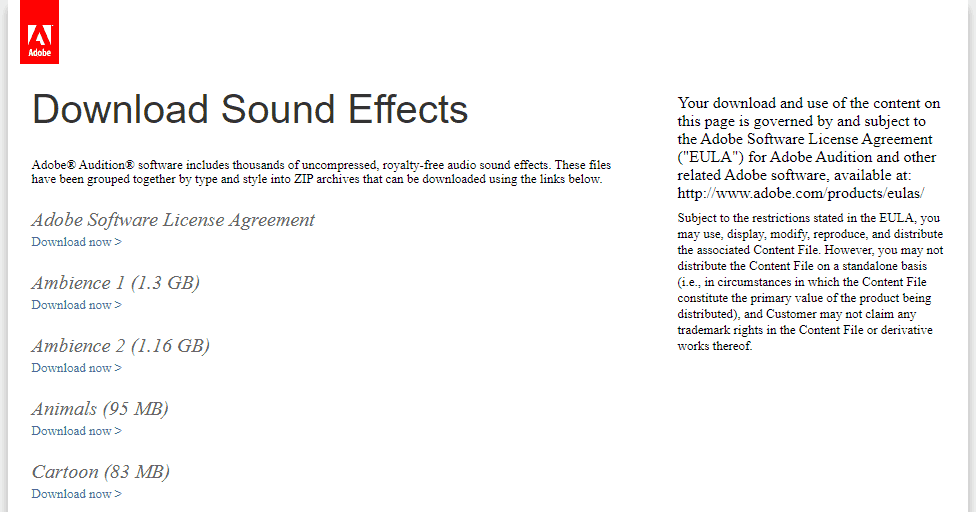 The only disadvantage of the Adobe Audition Sound Effects repository, when compared to the previous entries in this article, is that you can’t preview the sounds before downloading. They don’t even offer audio demos of the included sound effects. But still, with such a quick and easy download process, you might as well download these free sound effects and browse them on your local hard drive.