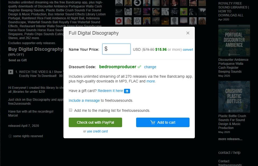 The minimum price will be reduced to $15.96 (you can still enter any amount). After completing the checkout process, you will receive over 270 sound libraries released by Free To Use Sounds. The number of included sound libraries is growing constantly. At the moment of writing this article, the bundle amounts to over 550 GB of audio recordings.