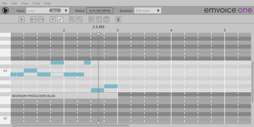 Now let’s talk about the limitations. The free version of Emvoice One features a single female voice called Lucy. Before purchasing the full voice pack for a whopping $200, Lucy can only be used to sing a seven-note range, from H2 to D3. If you draw a note outside this range, the entire sequence will be highlighted in red and Emvoice One won’t play any audio. This is a huge limitation for anyone who intends to use the plugin as a substitute for a real singer. But there’s still plenty of fun to be had with less demanding melodies or simple vocal phrases and spoken words that fit within Lucy’s demo range.