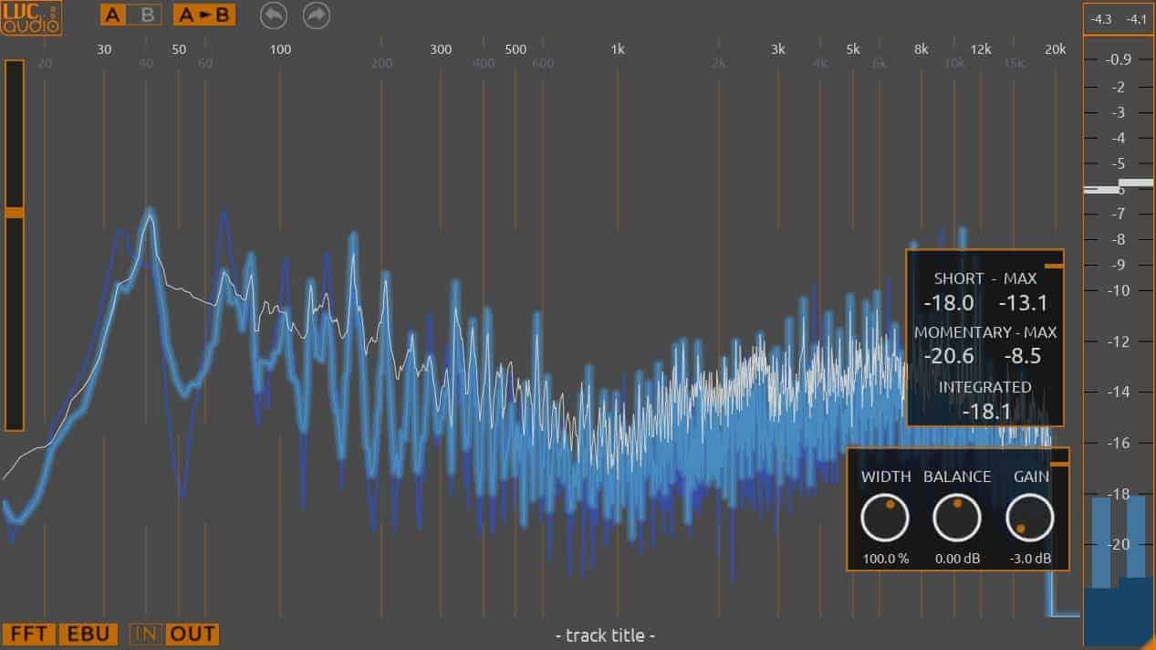 It’s worth noting that LVC-Meter isn’t just a metering tool. The plugin can be used to control the gain, stereo balance, and stereo width of the analyzed audio signal. Right-clicking the Gain and Balance control knobs will reveal a drop-down menu with the advanced controls for A/B testing and more precise fine-tuning.