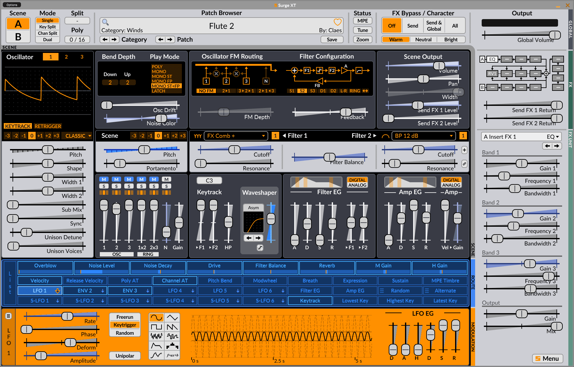 The synthesizer features three oscillators with multiple synthesis types, complex modulation, built-in effects, and numerous presets. The interface is now more intuitive than the previous versions, making Surge XT more suitable for beginners.