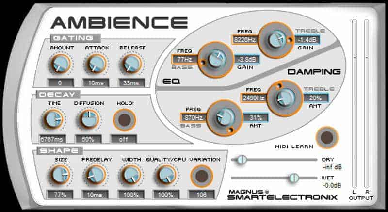 Next up in the epic reverb category is Ambience by Magnus. A classic reverb VST plugin that’s been around for ages, Ambience still manages to impress with its full sound and clean reverb tales that stand strong even by modern standards. Ambience shines as a specialized reverb unit for emulating massive spaces and surreal cosmic atmospheres. It also features a gate module for achieving the signature 80s gated snare sound.