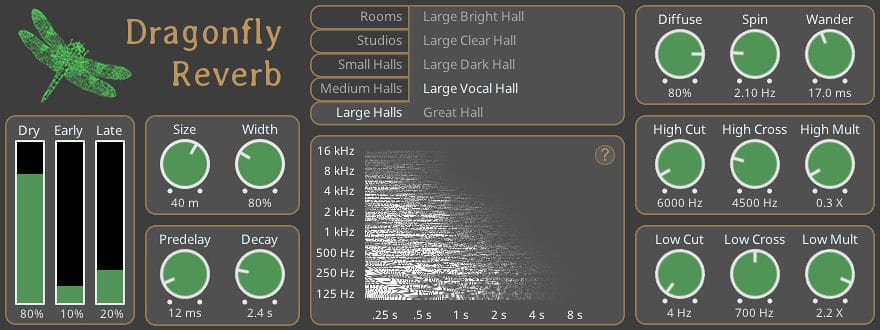 The plugin covers a range of room types, from small recording rooms and studio-like spaces to small and large halls. The sound of the room can be adjusted using multiple tone controls, as well as by tweaking its size, width, diffusion, and other properties. Dragonfly is equally effective as a mixing tool for simulating realistic rooms and a sound design utility for creating huge and artificial sounding spaces.