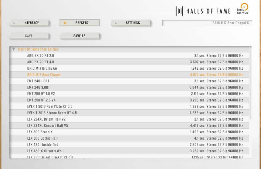 Even though it is very limited compared to the other versions of HoF 3, the free edition still offers great value, especially considering the quality of the included convolution reverb presets. Featuring the sounds of classic hardware reverbs such as the EMT 240, AKG BX 20, Lexicon PCM96, and Bricasti M7, this is a great little reverb unit to add to your arsenal completely free of charge. Take a closer look at the included reverb presets on the screenshot below.