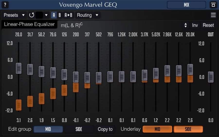 Marvel GEQ is a 16-band linear-phase graphic equalizer by Voxengo. The benefit of using a graphic equalizer is the ability to quickly apply a broad shape adjustment to a full mix. Also, a linear-phase equalizer uses linear-phase filters that preserve the original wave shape and don’t introduce any phase shift artifacts.