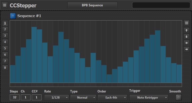 CCStepper is my favorite one of the bunch. It is a MIDI CC data sequencer, suitable for controlling MIDI capable software or external devices. Basically, you pick a CC# and use the provided 64-step sequencer to send host synced MIDI data. You can pick any number of steps between 1 and 64 and the rate goes from 32/1 to 1/128, which is simply brilliant. The sequencer can be synced to host (default setting), but it can also be triggered by incoming MIDI notes. The Smooth function smooths out the steps in the current sequence, resulting in a more natural LFO-like performance. There are several other neat features hidden under the hood, like step randomization, preset sequences, different playback modes, etc. If you’re looking for a MIDI CC# generator for your DAW, this plugin is a great candidate.