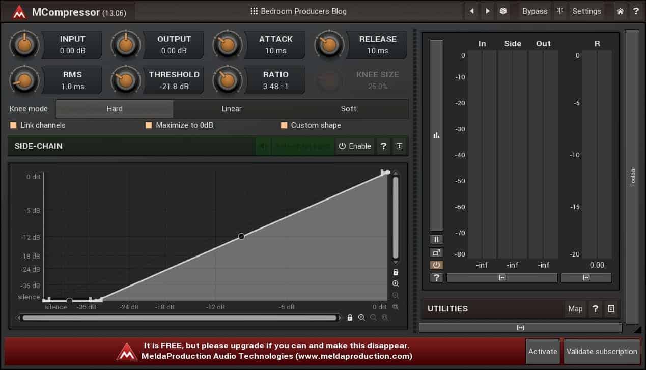 Apart from this standout feature, MCompressor offers a set of standard compression knee modes (linear, hard, and soft), a sidechain input, as well as the standard gain and time controls. The user can adjust the input and output volume, compression ratio and threshold, and the attack and release time values.