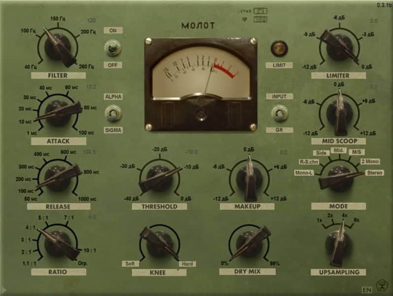 The plugin’s GUI looks like a gadget that came straight from a Soviet nuclear submarine. Quite frankly, the looks should give you a good idea of what Molot can do to the processed audio signal if pushed to more extreme settings.