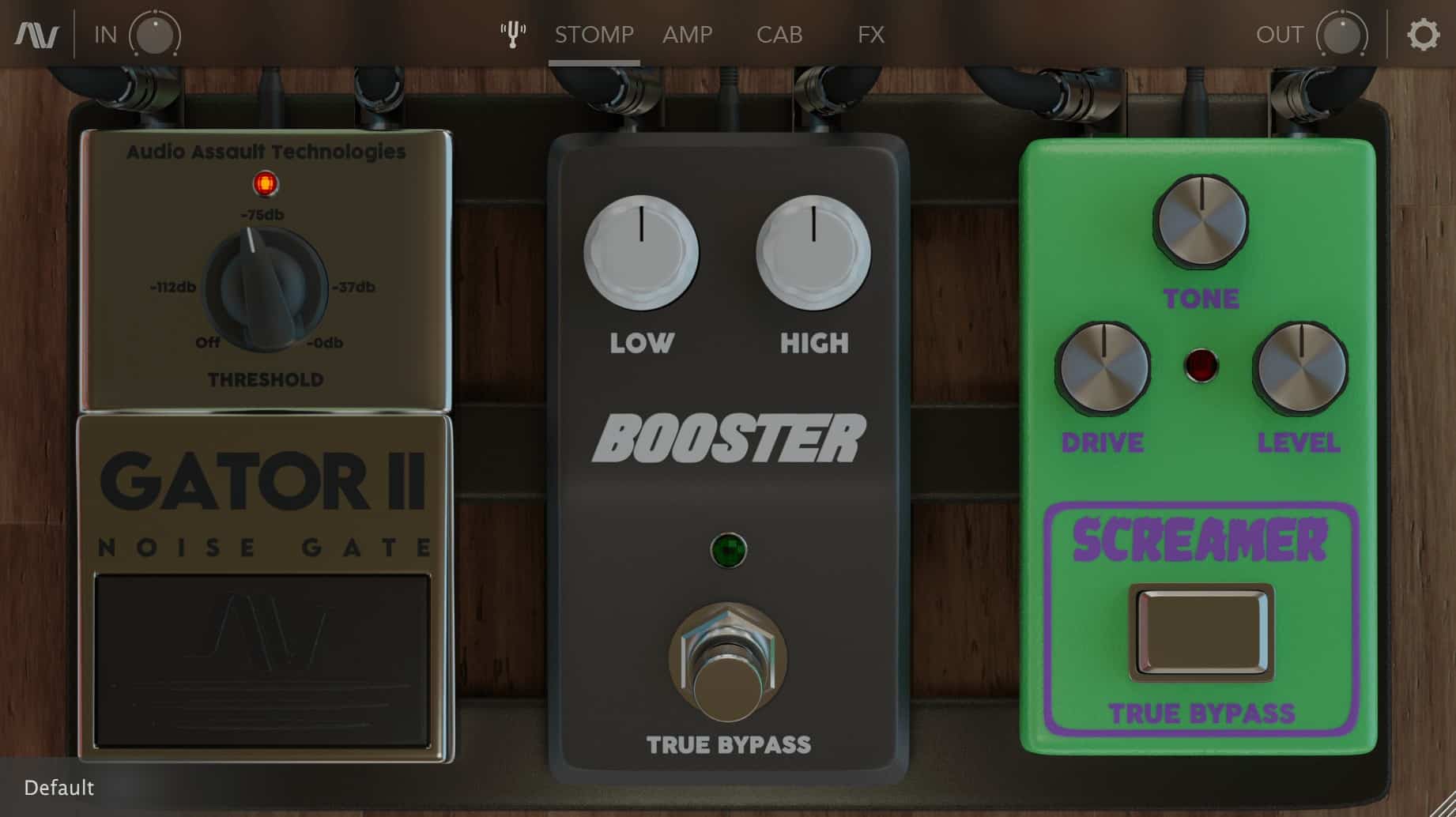 Things get a bit more interesting in the Stomps section. Audio Assault included three free guitar pedal sims to get you started. There’s a noise gate, a booster pedal, and the Screamer distortion which emulates one of the most widely-used distortion boxes.