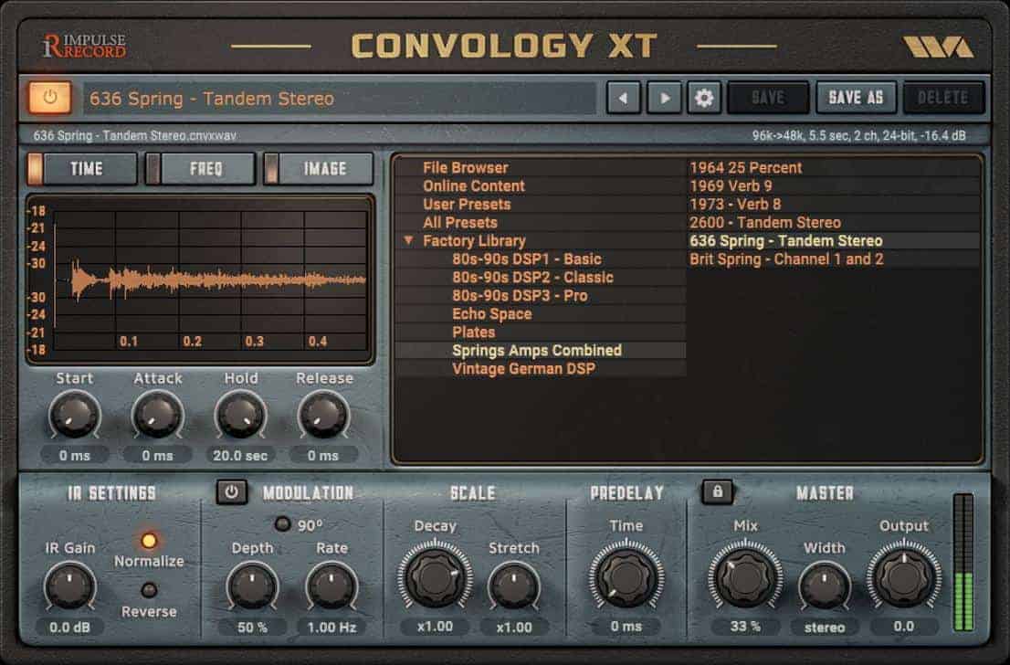 Convology XT is a free convolution reverb VST plugin developed by Impulse Record. It includes a collection of 70 reverb impulse responses captured from a variety of vintage hardware reverb units. Additional impulse responses are available for purchase on the developer’s website. More importantly, the plugin is capable of loading external impulse responses in WAV format.